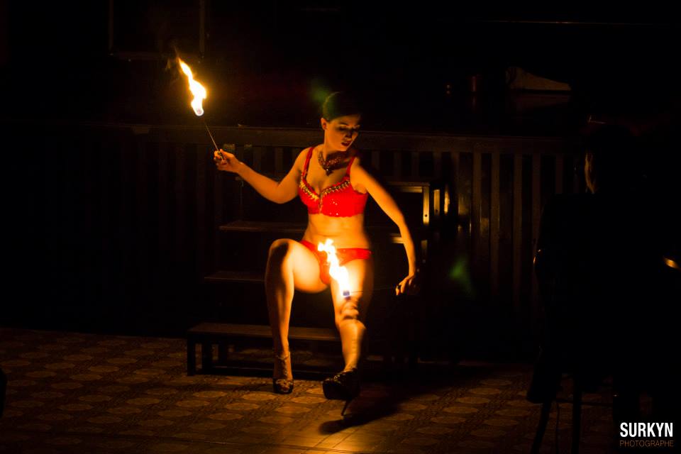 A l’étage sur le coup de 17h c’est le Candy Coates Circus qui ouvre le bal avec un florilège d’effeuillages burlesques très réussi qui captive l’assemblée assise autour de tables rondes éclairées aux chandelles.
